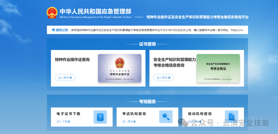 方法二:對(duì)于新版證書?墒褂谩疤胤N作業(yè)操作證及安全生產(chǎn)知識(shí)和管理能力考核合格信息查詢平臺(tái)”或微信公眾號(hào)(國(guó)家安全生產(chǎn)考試)查詢證書