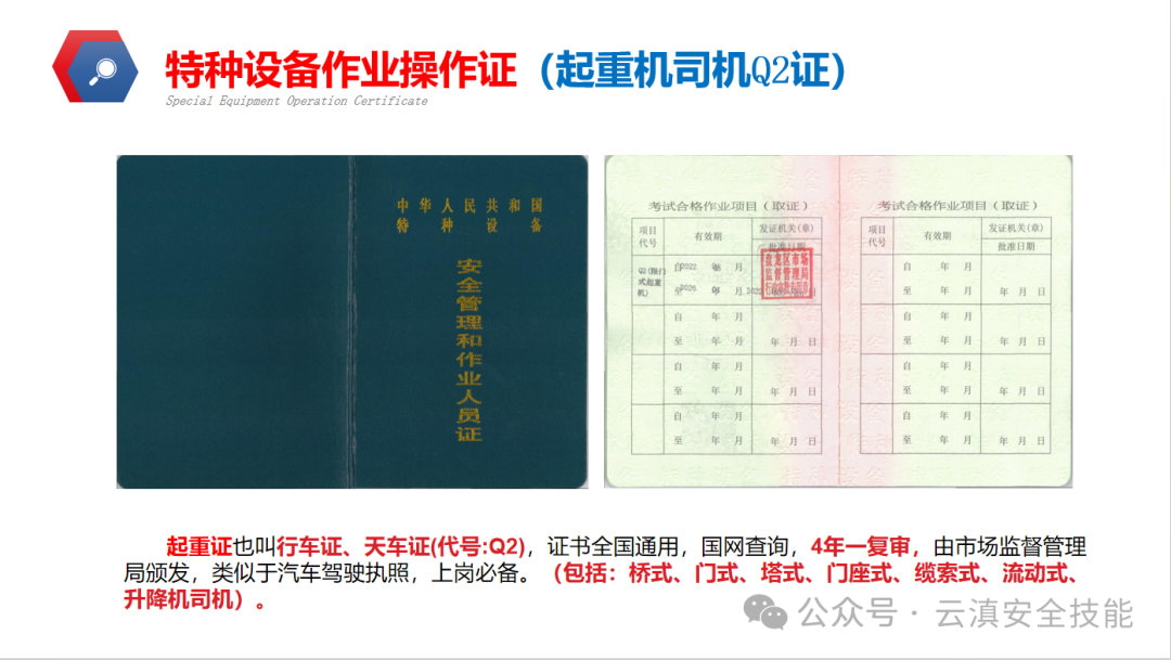 發(fā)證機(jī)關(guān):市場(chǎng)監(jiān)督管理局(原來(lái)的質(zhì)監(jiān)局),證書(shū)4年一審,證書(shū)全國(guó)通用,上崗必備。報(bào)名后由學(xué)校統(tǒng)一組織培訓(xùn),培訓(xùn)完統(tǒng)一組織到考試點(diǎn)考試,理論、實(shí)操成績(jī)合格后,由發(fā)證機(jī)關(guān)制證后方可取得。