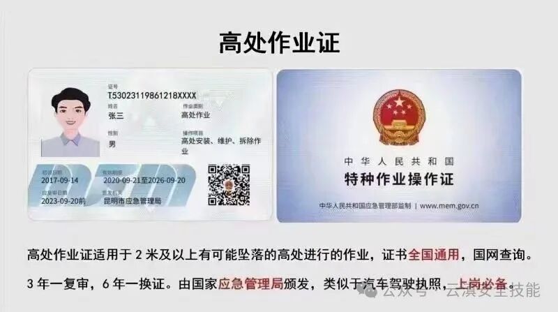 第三種:高空作業(yè)證(高處安裝、維護(hù)、拆除作業(yè))。