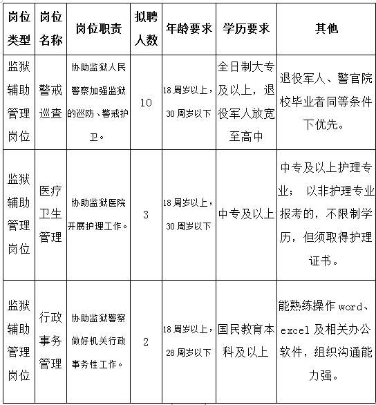 本次擬招聘警務(wù)輔助崗位15人,詳見附表1(云南省楊林監(jiān)獄2021年招聘警務(wù)輔助人員崗位表)。